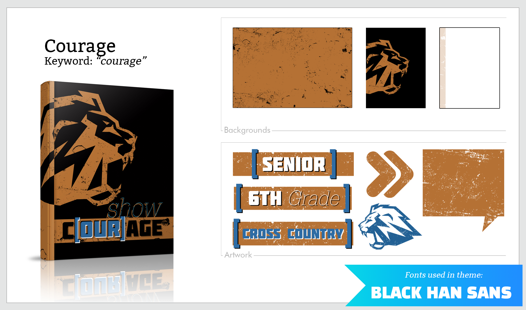 A marketing design featuring the theme 'Courage' with a book cover, background textures, and artwork including text labels such as 'SENIOR', '6TH', 'Grade', 'CROSS COUNTRY', and a lion graphic, all in a black, brown, white, and blue color scheme using the font 'Black Han Sans'.