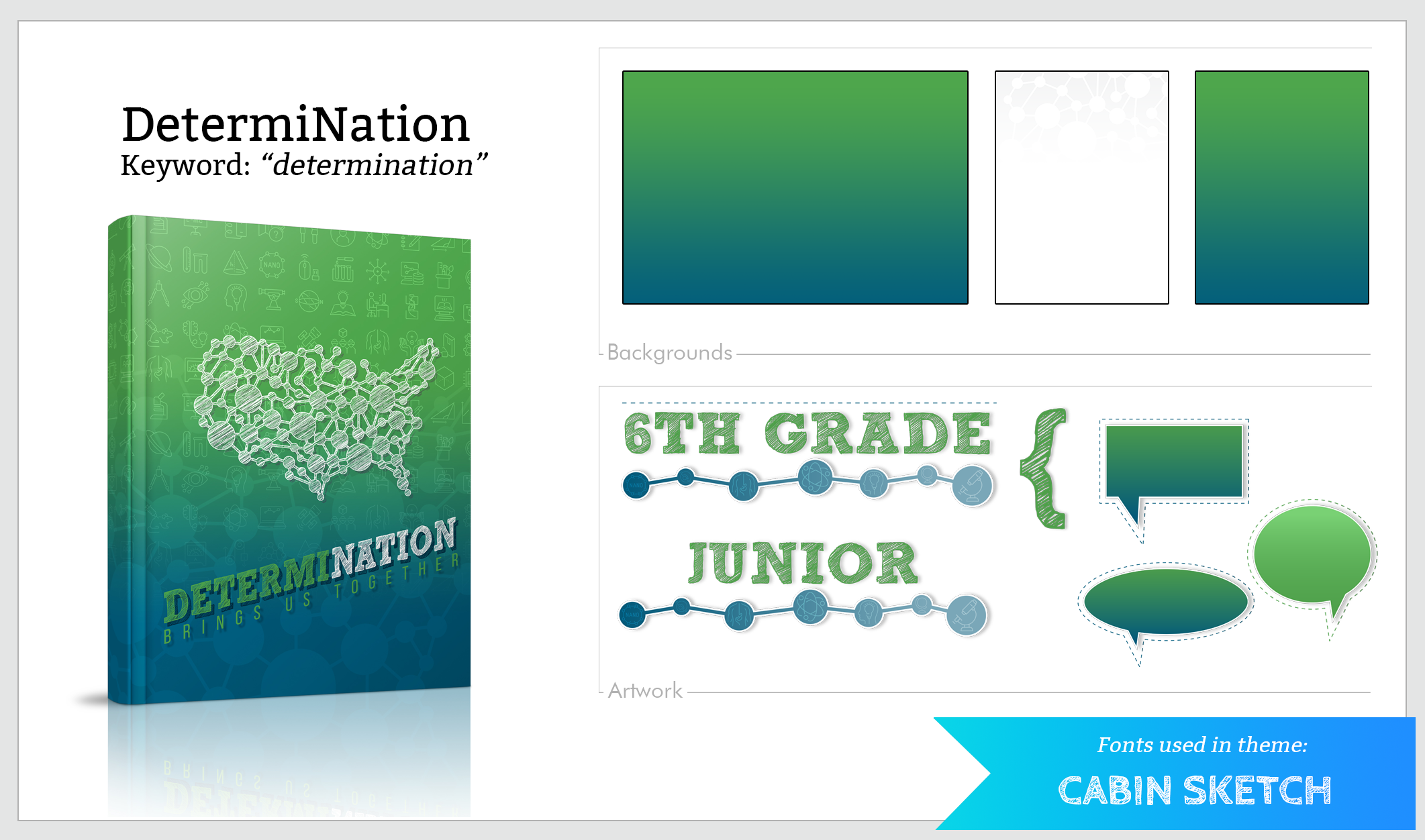 Book cover titled 'DetermiNation' with a molecular structure and the tagline 'Brings us together.' The theme features green, blue, and white colors, with a background of scientific icons. Decorative elements include a timeline labeled '6th Grade' and 'Junior,' speech bubbles, and a blue banner that reads 'Fonts used in theme: Cabin Sketch.'