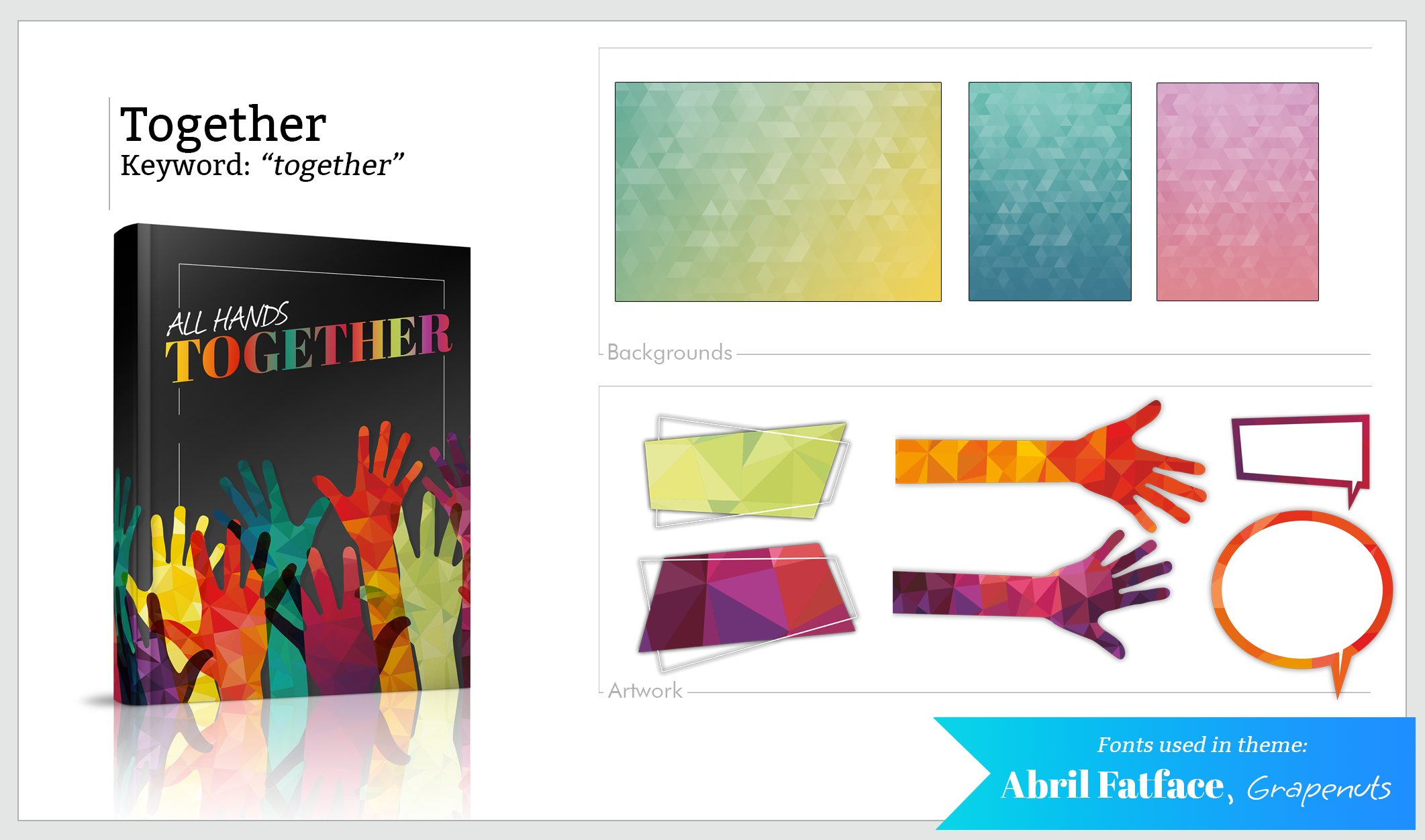 Design elements for a campaign called 'All Hands Together,' featuring colorful polygonal hands, backgrounds with gradient and polygonal design, speech bubbles, and labels indicating font themes of Abril Fatface and Grapinit.
