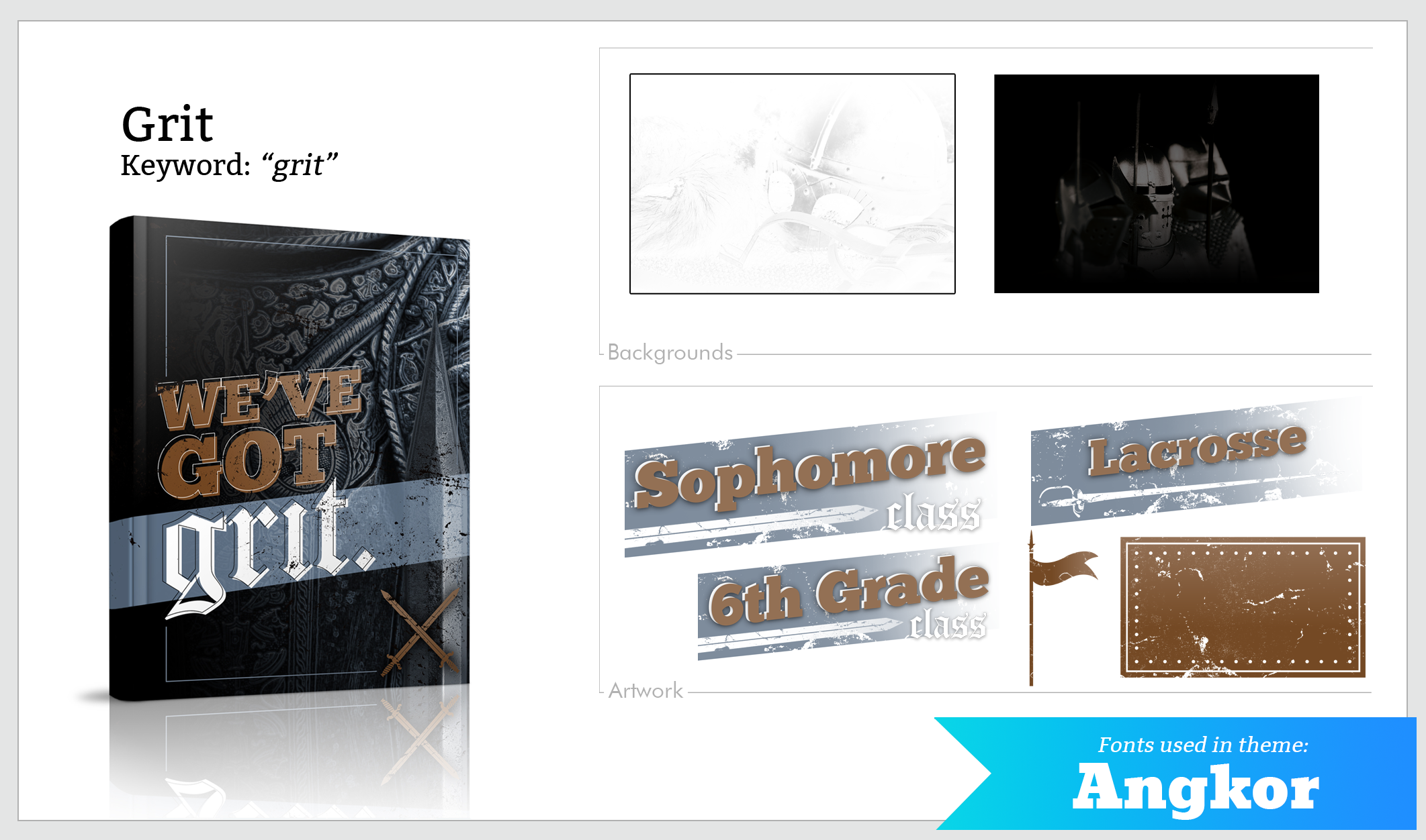Design template featuring a book cover with the title "We've Got Grit" and various gritty themed graphics and text styles, including background images, font styles, and labels for school levels and sports like Lacrosse, all using Angkor font.