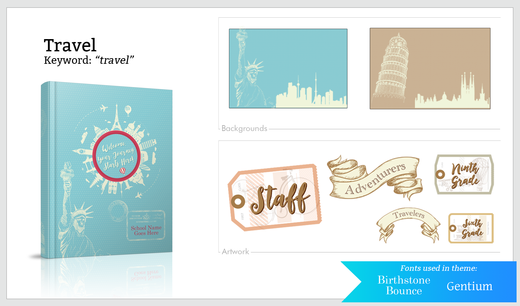 Design template for a travel-themed school project cover with background images of the Statue of Liberty and the Pisa Tower, and artwork of labels reading 'Staff', 'Adventurers', 'Travelers', and grade levels, using fonts Birhtstone Bounce and Gentium.