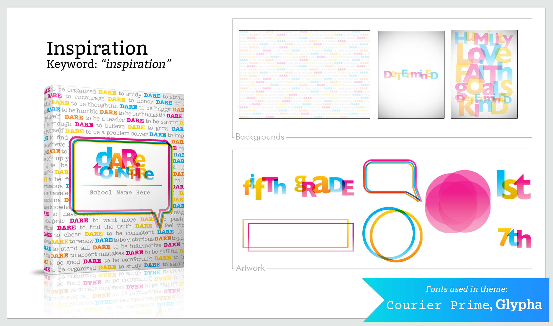 A promotional design features a black book cover with the words 'let your light shine' and an illuminated light bulb. The design includes three background swatches in dark blue, white, and a gradient beige. It also displays example artwork with the words 'freshman' and 'baseball' in different fonts, framed by decorative elements like braces and quotation marks, and illustrations of light bulbs. The theme font used is 'Comforter.'
