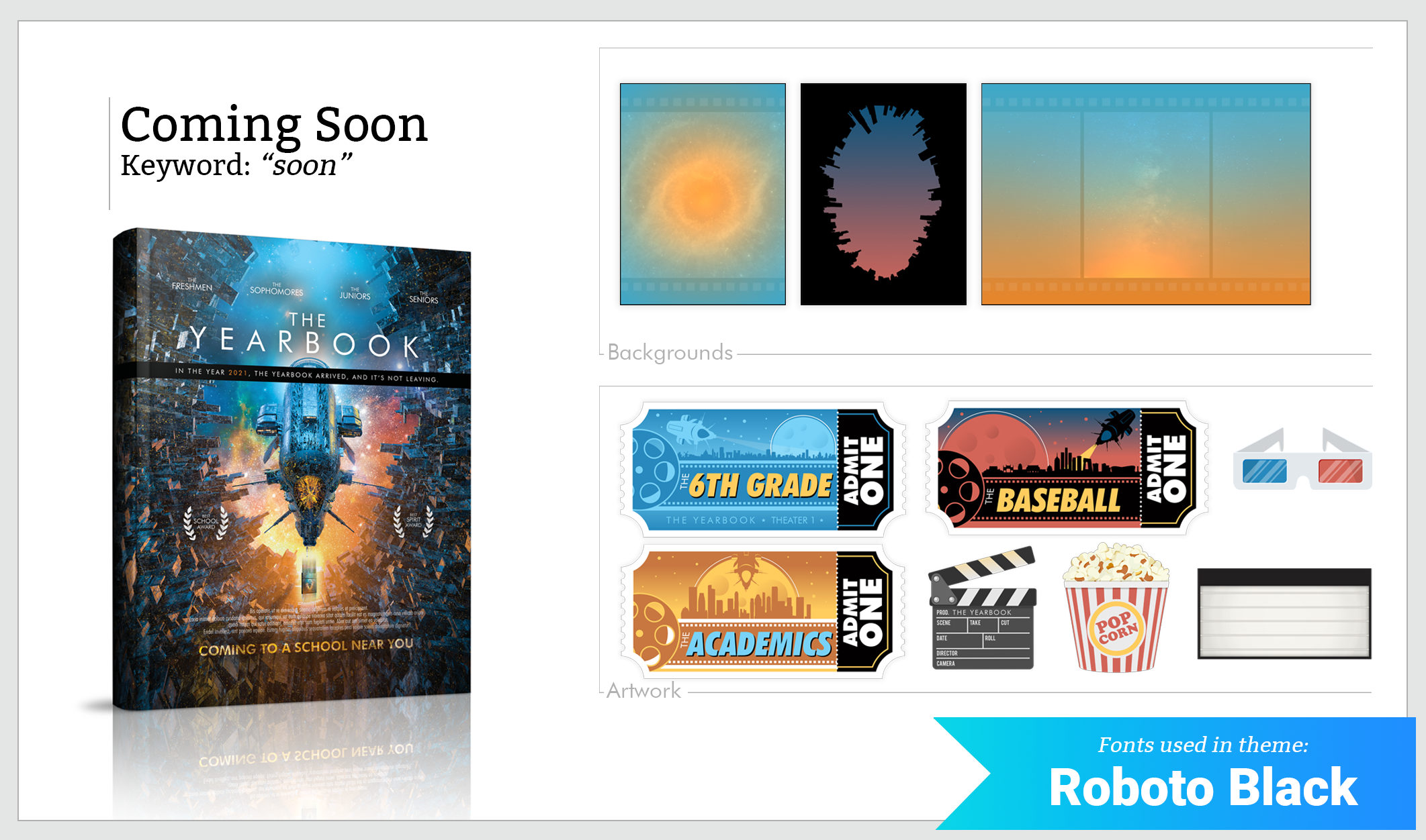 A school yearbook cover with space-themed background, including sunset, starry sky, and colorful vignette. Accompanying graphics include digital art with movie ticket stubs for 6th grade, baseball, and academics, a popcorn bucket, clapperboard, 3D glasses, and a film strip. The theme uses Roboto Black font.