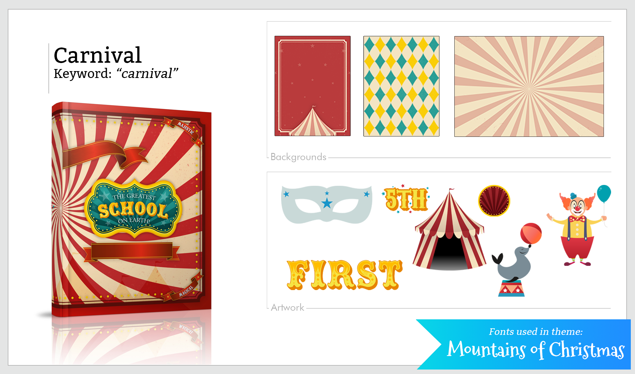 Board showcasing various carnival-themed backgrounds and artwork, including circus tent, clown, whale, mask, and text like '5th FIRST' with font examples and a carnival book cover titled 'The Greatest School on Earth,' all in a vintage style with red, yellow, and blue colors.