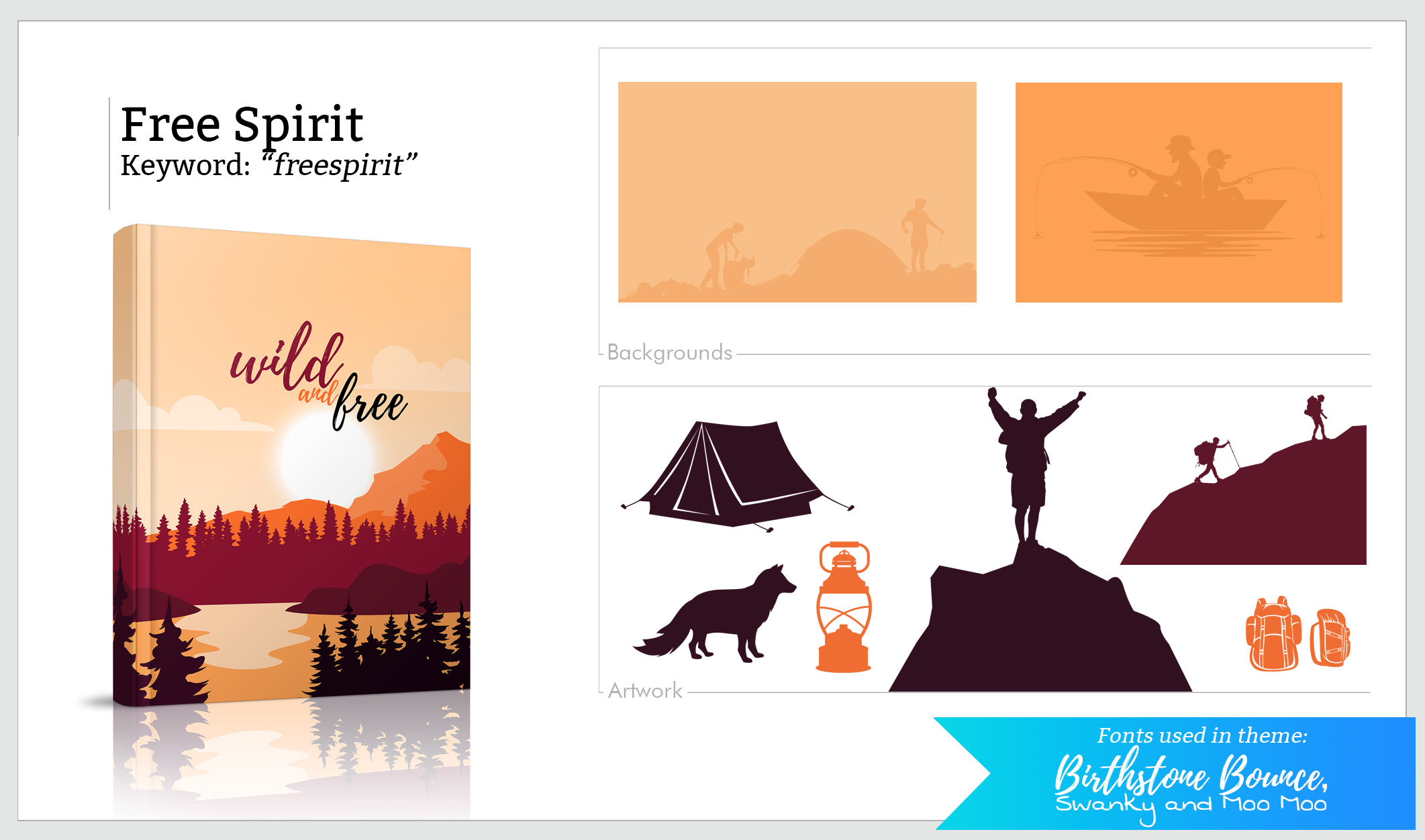 Sample presentation slide with a book cover titled 'Wild and Free' featuring a sunset over a forest and mountains. Juxtaposed are silhouette illustrations of camping scenes, hiking, and camping gear, with a blue banner mentioning fonts: Birthstone Bounce, Swankly, and Moo Moo.