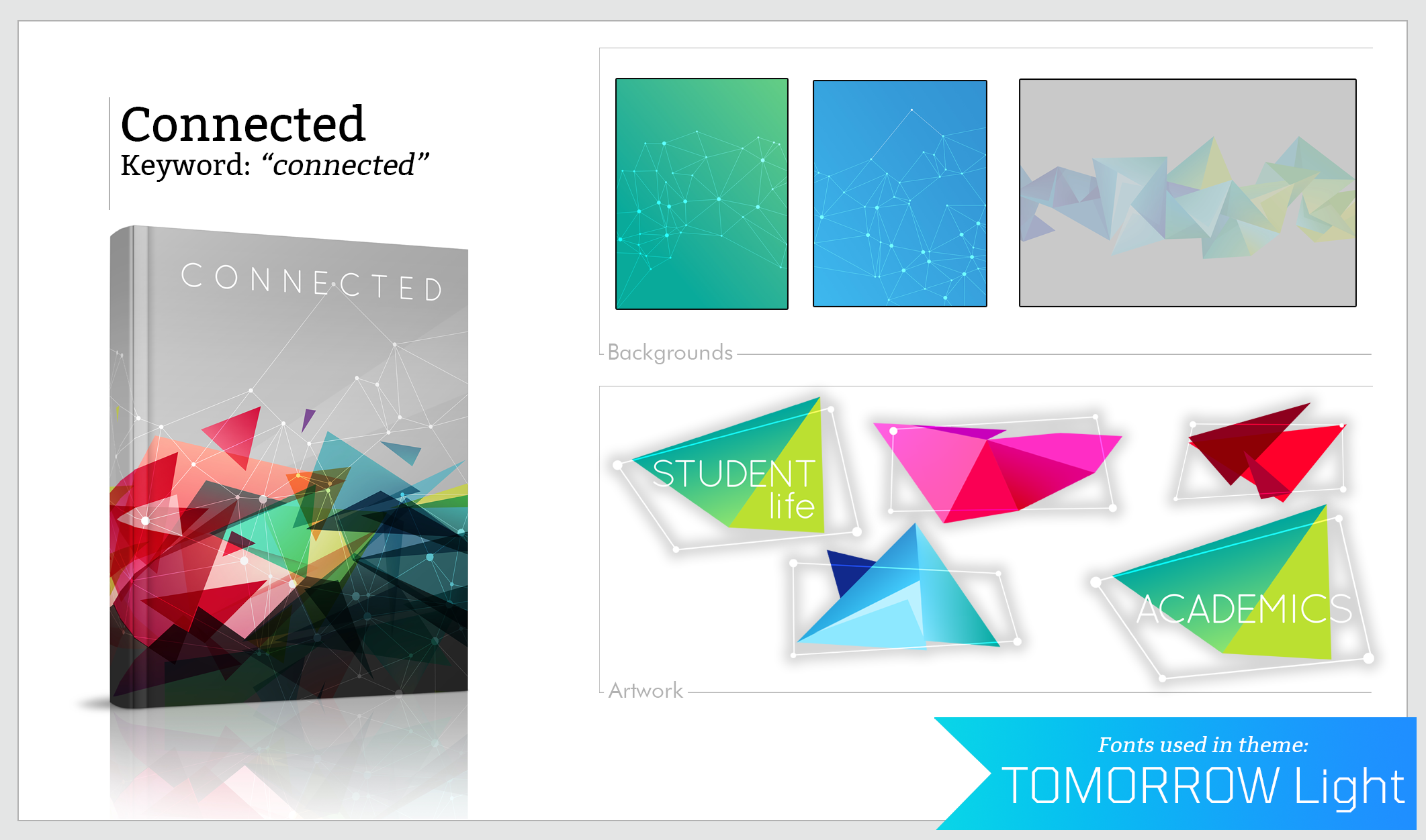 Cover of a book titled 'Connected' with a geometric, colorful, abstract design. The image also shows background textures in shades of green, blue, and gray, and artwork with 3D triangular shapes labeled 'STUDENT life' and 'ACADEMICS'. Text indicates the theme uses the font 'TOMORROW Light'.