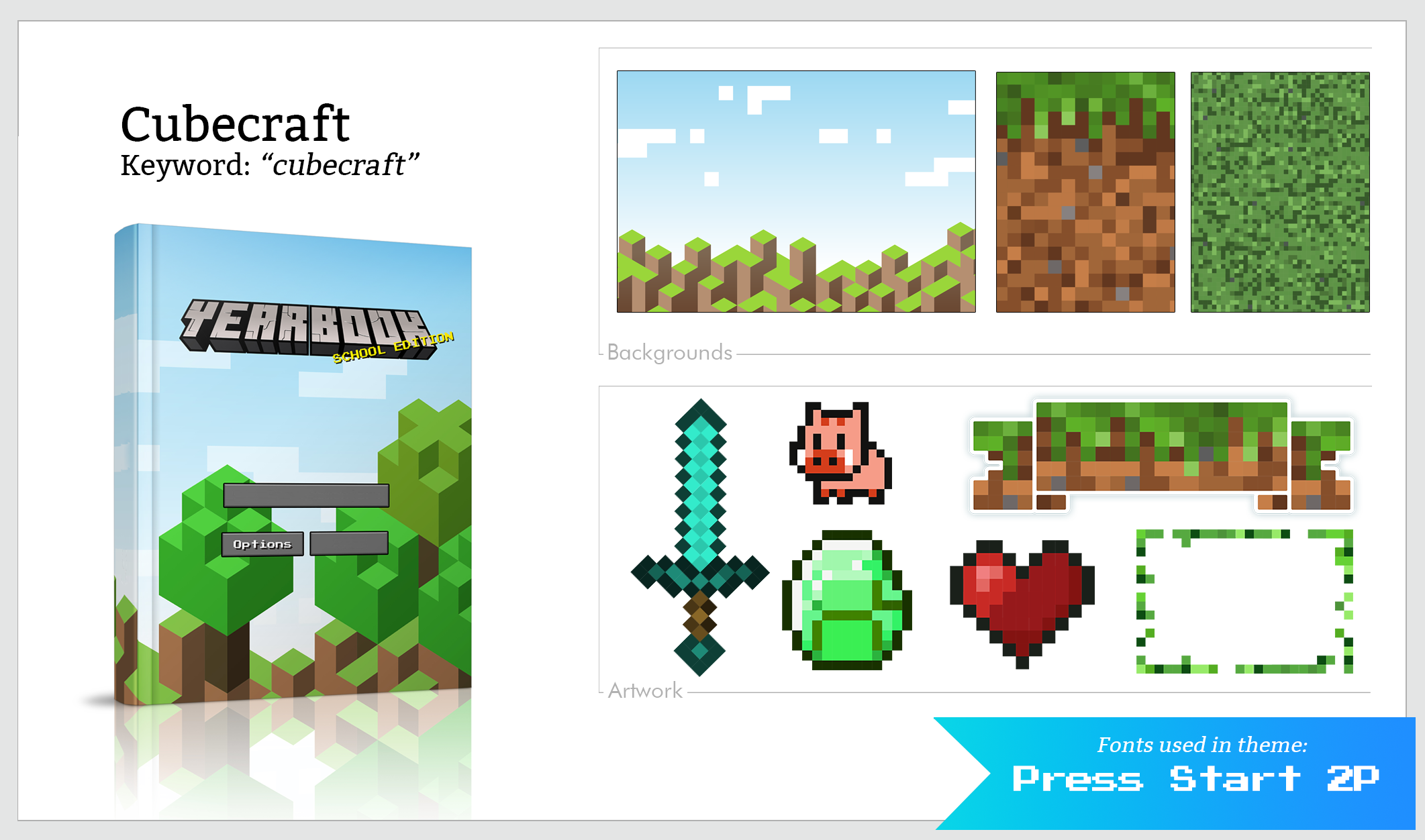 A screenshot of a Minecraft-themed user interface, showing background and artwork options, including block textures, pixel art icons such as a sword, pig, grass, diamond, heart, and a dashed green border. The interface promotes the game "CubeCraft: School Edition" and displays the text "Press Start 2P" in the bottom right corner.