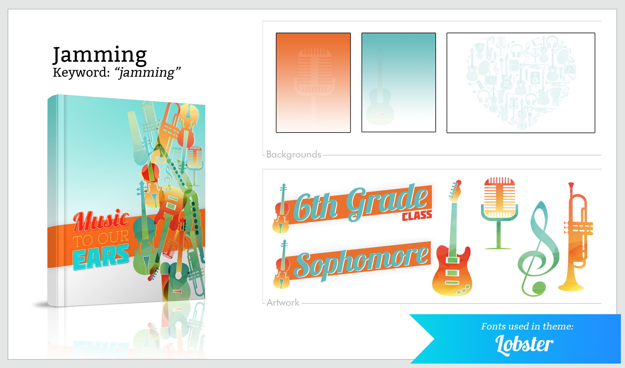 Book cover titled 'Music to Our Ears' with colorful illustrations of various musical instruments and text 'Jamming'. Additional graphics show background and artwork with text '6th Grade Class' and 'Sophomore', featuring musical instruments. Bottom banner states 'Fonts used in theme: Lobster'.