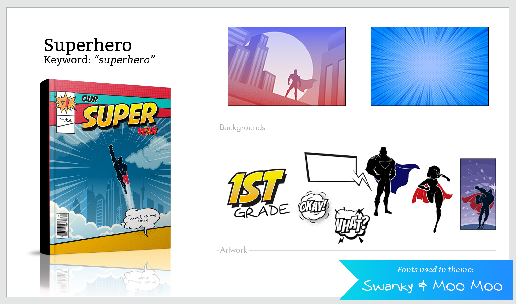 A colorful superhero-themed school yearbook cover with a cartoon superhero flying over a cityscape, and comic-style graphics with words like '1st Grade,' 'OKAY!,' 'WHAT?,' and superhero silhouettes, set against a light background.