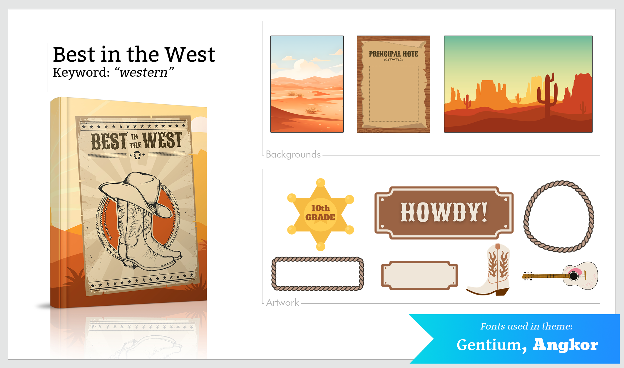 Design elements inspired by Western theme including backgrounds of desert with hills and cacti, a pirate note paper, a sheriff badge with '10th GRADE', the word 'HOWDY!' on a wooden sign, rope border, cowboy boots, and an acoustic guitar, with notes on fonts used being Gentium and Angkor.