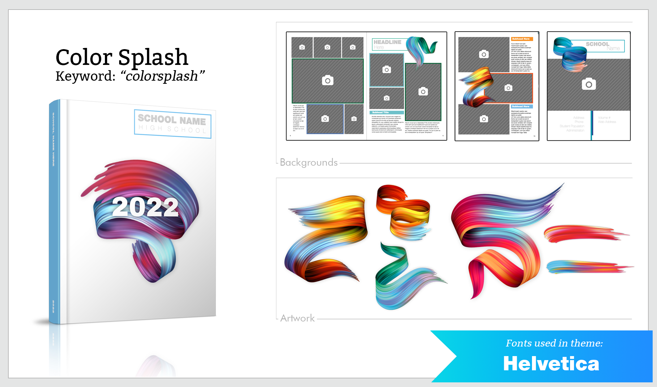 Cover of a 2022 high school yearbook with a colorful, abstract swirl of paint strokes design and a 3D effect, featuring the year 2022 and space for school name, along with sample page layouts, background color designs, and artwork elements in vibrant colors, with a blue banner indicating Helvetica fonts used in the theme.
