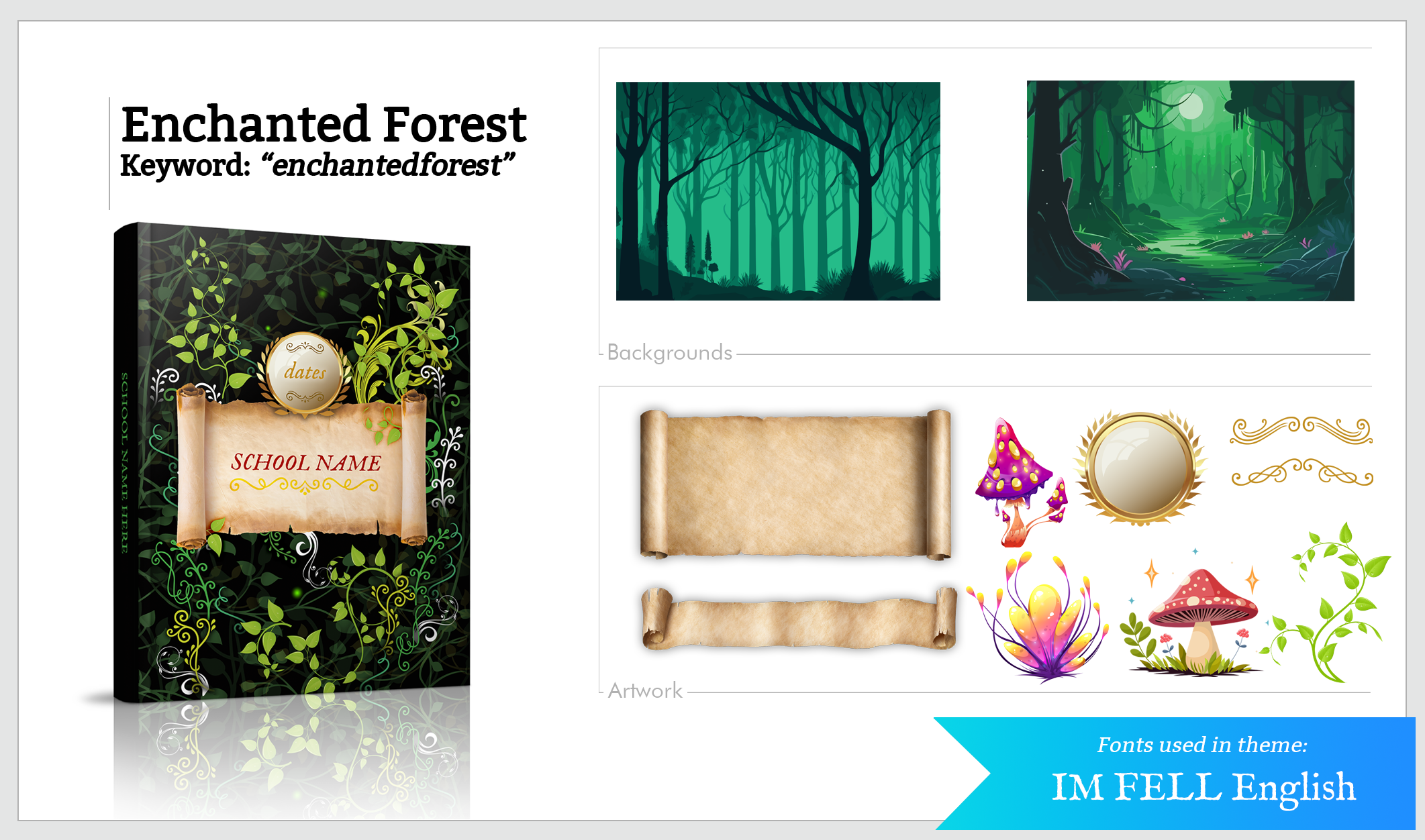 Design template for an enchanted forest-themed book cover with background illustrations of a dark green forest and a bright green forest, scrolls for text, decorative icons including mushrooms, a mirror, and floral elements, and a blue banner indicating the theme "IM FELL English."
