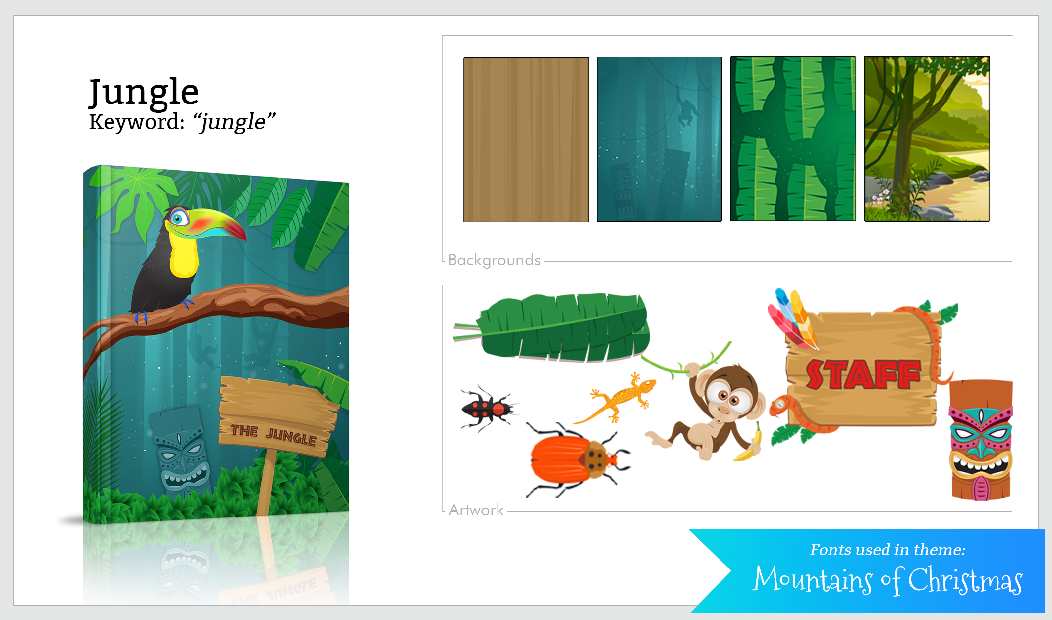 A colorful illustration of a jungle scene with lush green leaves, a toucan bird perched on a tree branch, a totem mask, and a wooden sign that says 'The Jungle'. In the background, there are four different jungle-themed backgrounds with trees, water, and greenery. Additional artwork includes jungle animals, a monkey, insects, and a staff with feathers and a mask, all part of a theme titled 'Mountains of Christmas'.