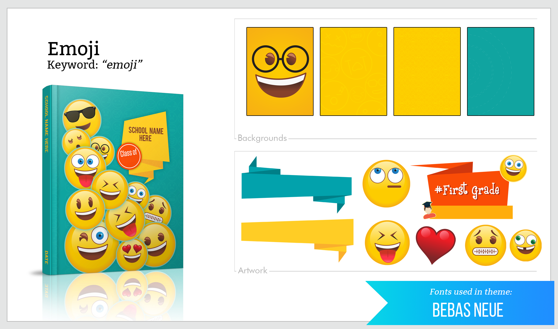 Design template featuring various emoji illustrations, backgrounds, banners, and artwork for a school-themed project with fonts by Bebas Neue.