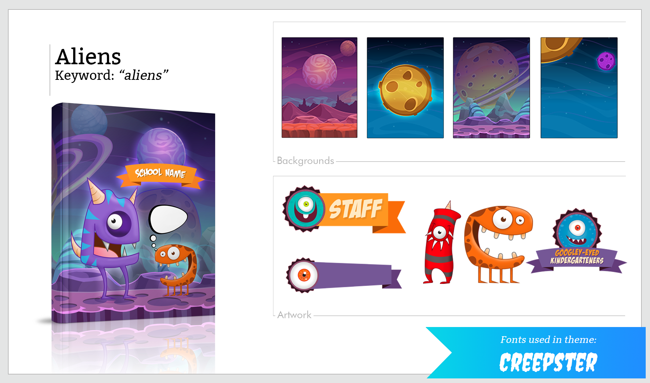 Science-themed cartoon illustration featuring alien characters and space backgrounds, with labels for school name, staff, and kindergarteners, in a creepster font style.