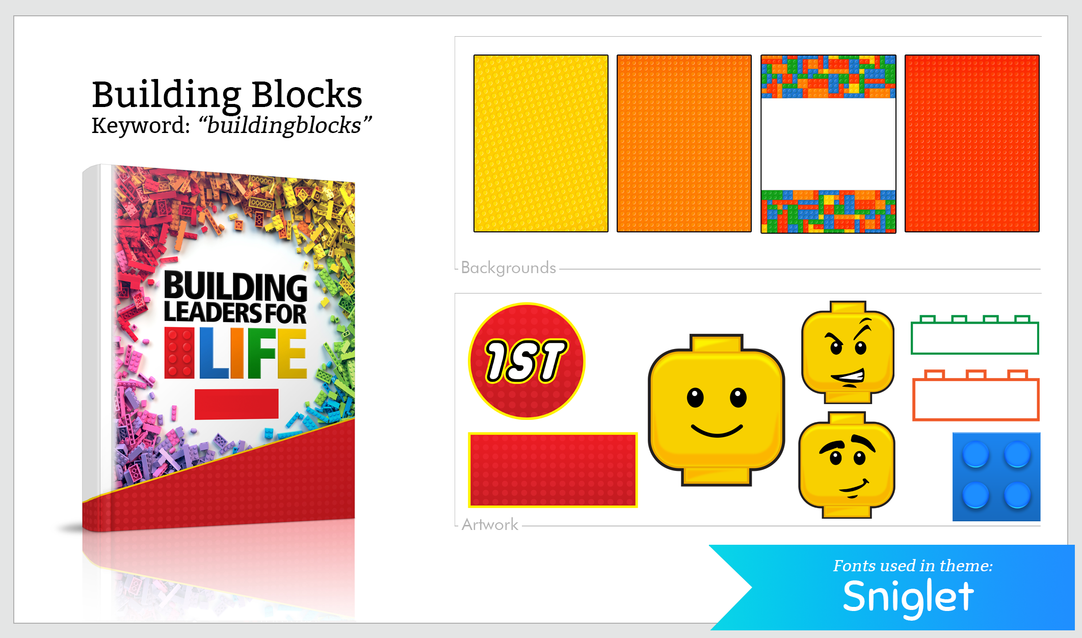 An infographic about building blocks featuring a book titled 'Building Leaders for Life' with visual elements of Lego-style toys, including backgrounds, artwork, and Lego bricks, highlighting a theme using the font Sniglet.
