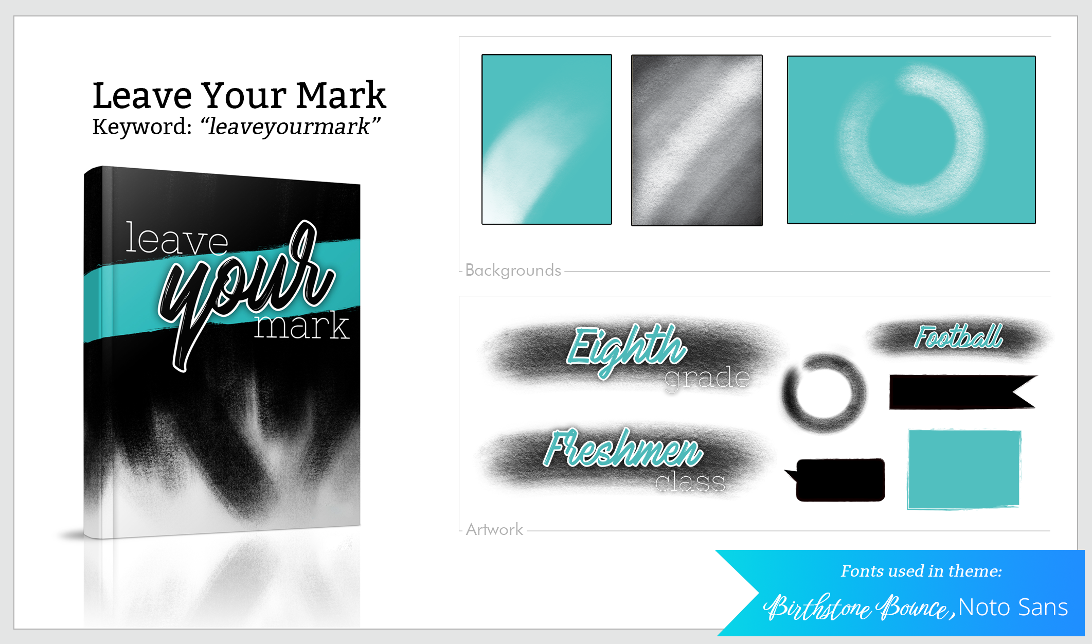 Design template for a book cover titled "Leave Your Mark" with a teal and black color scheme, featuring various background textures, spray paint style text, and graphics for school-related themes like eighth grade, freshmen, football, and flags, with typography details and font information.