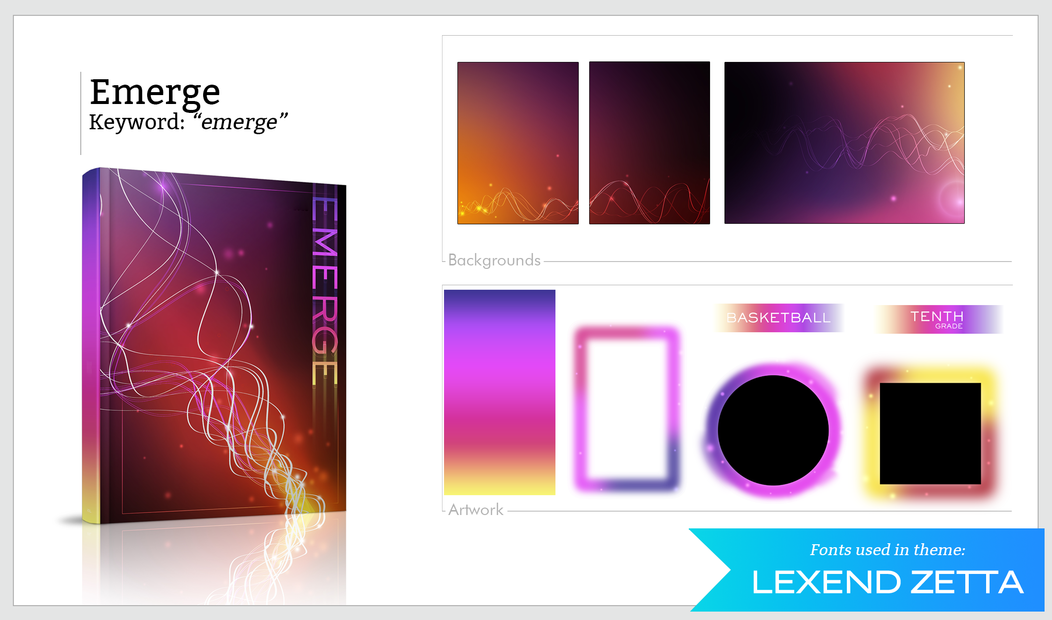 Design mockup for a theme titled "Emerge" featuring colorful abstract backgrounds, art styles of glowing rectangles, circles, and squares, and text showing "Basketball" and "Tenth Grade" in neon-style fonts. The theme uses the Lexend Zetta font.