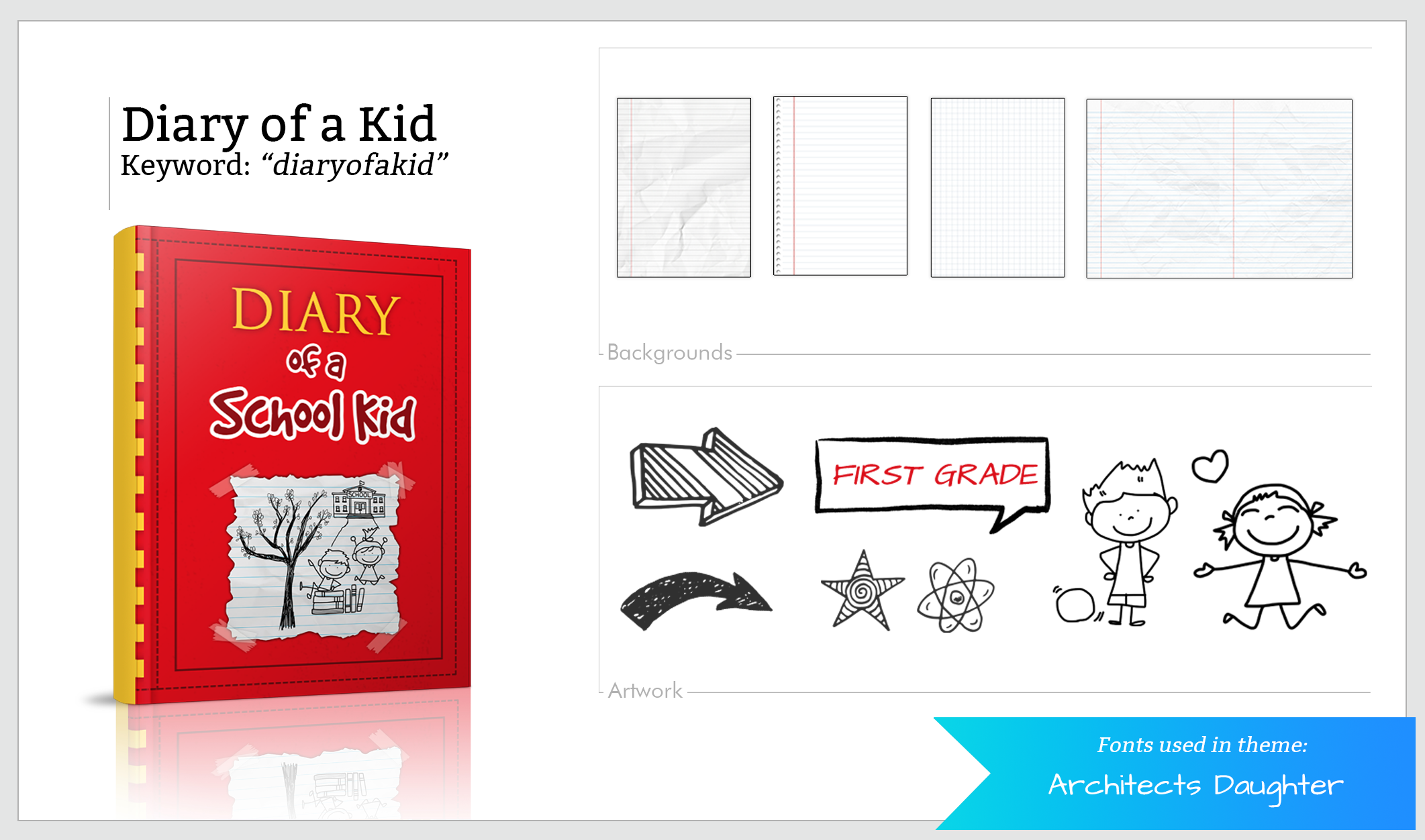 A presentation slide featuring a red notebook titled 'Diary of a School Kid' with cartoon drawings of children, school, and classroom themes. The slide includes background templates with torn paper and ruled lines, icons of arrows, a star, an atom, and children, and mentions fonts used in the theme called 'Architects Daughter'.