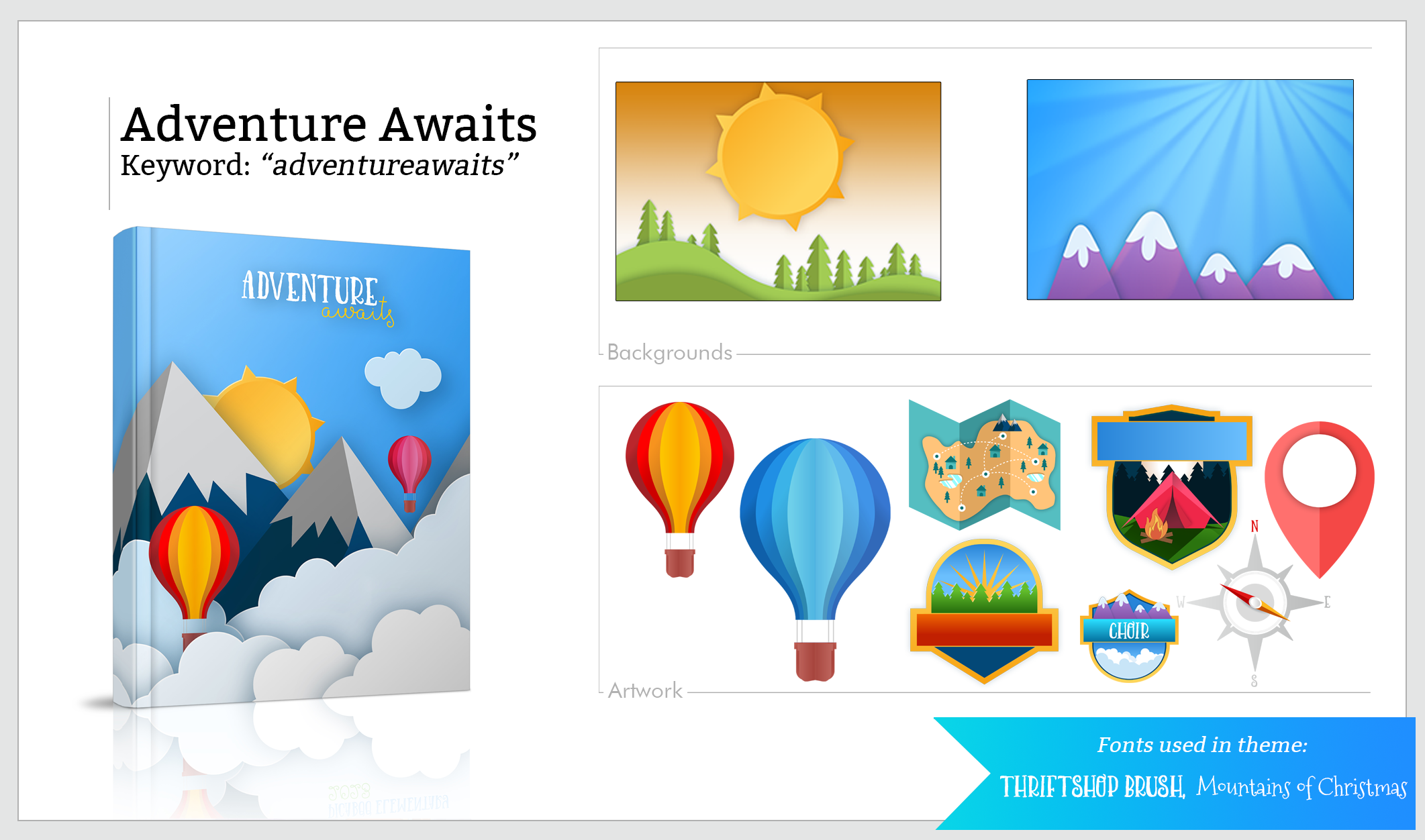 Design elements for a book titled 'Adventure Awaits' including mountain scenery, hot air balloons, a map, a campsite, a badge, a choir emblem, a location pin, a compass, and themed fonts.