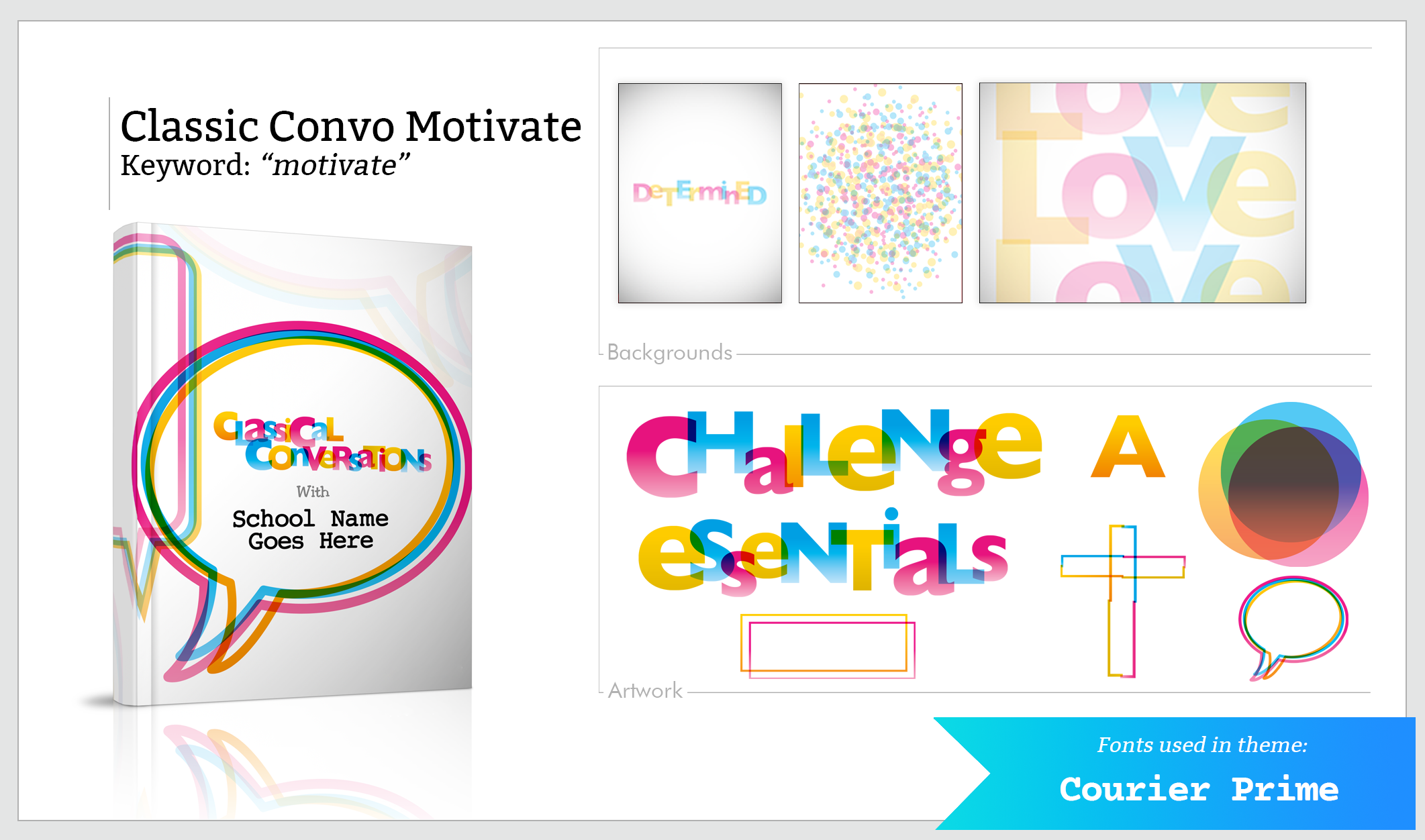 Cover design for a school project titled 'Classic Conversation' with colorful, overlapping text and graphic elements, including speech bubbles, a circle, and a cross, featuring the font Courier Prime.